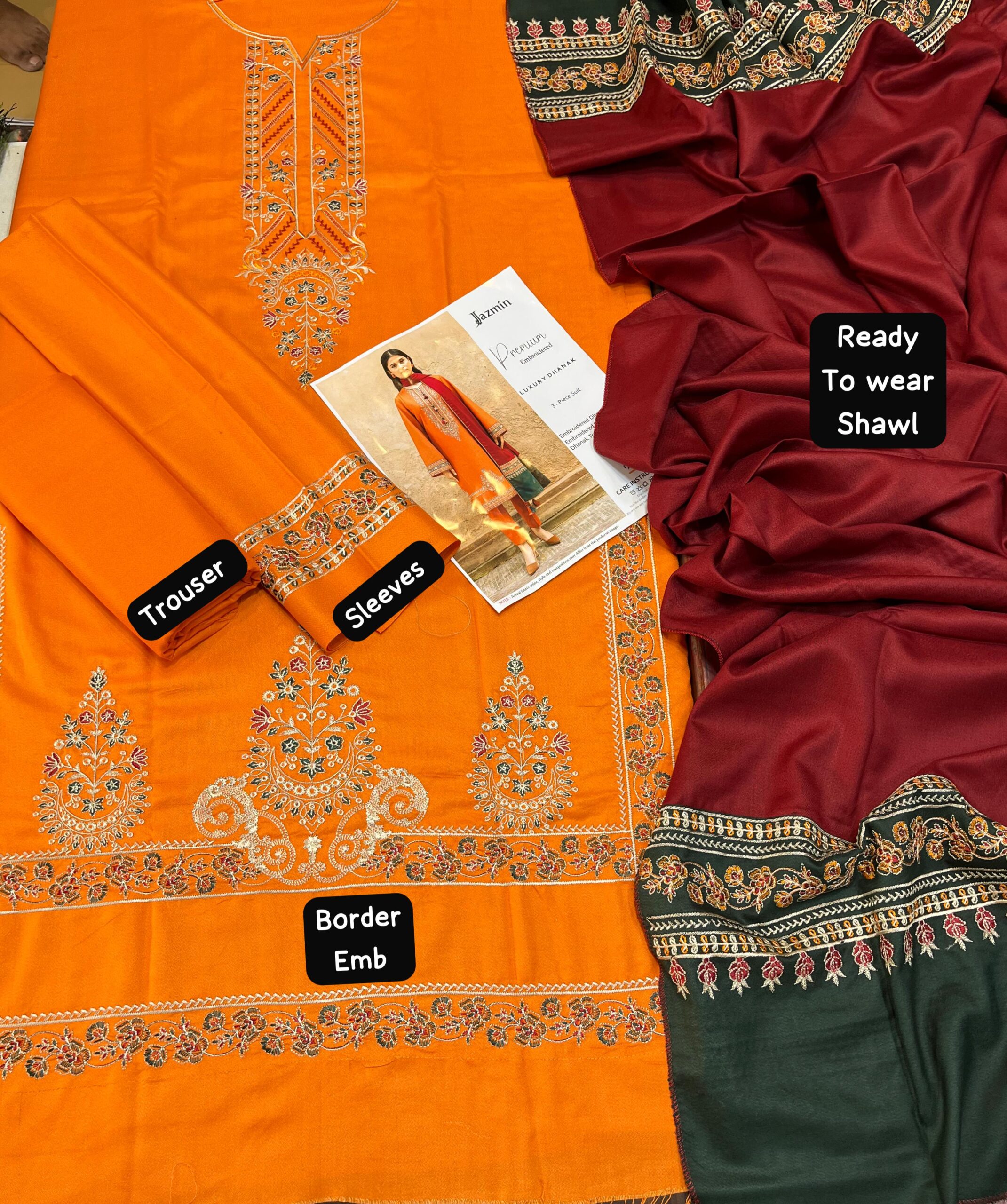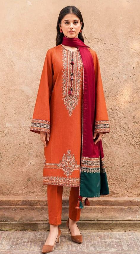 Elevate your winter wardrobe with the Jazmin Hit Code Dhanak Collection. This 3-piece suit features graceful embroidery on the borders and a beautifully crafted ready-to-wear Dhanak shawl. Designed for warmth and sophistication, it brings a rich seasonal vibe with its premium fabric, detailed embellishment, and authentic quality — perfect for festive and casual wear alike.