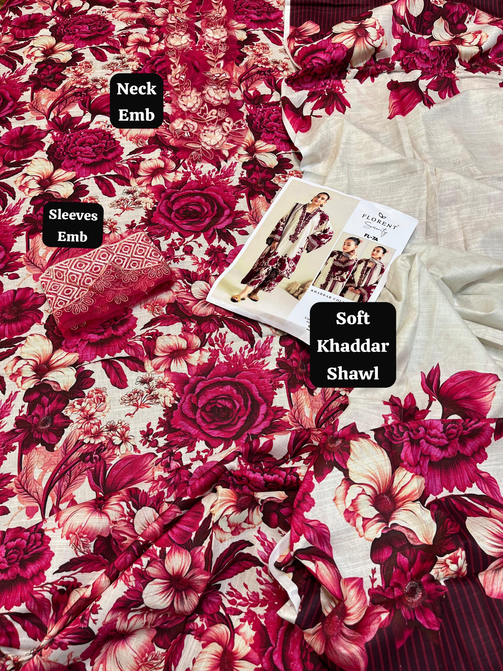 Discover the elegance of the Baroque 2K25 Khaddar Collection, featuring fine-quality soft khaddar fabric with a beautifully printed shirt, embroidered neckline, border, and sleeves. This 3-piece suit includes a printed soft khaddar shawl and matching trousers — perfect for refined winter wear.